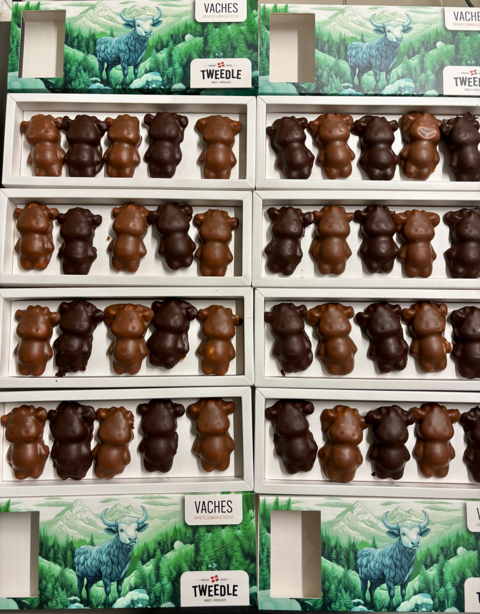 Des béliers à la vanille, des oursons à la myrtille et des vaches à la sapinette le tout enrobé de chocolat Valrhona, que demander de plus!